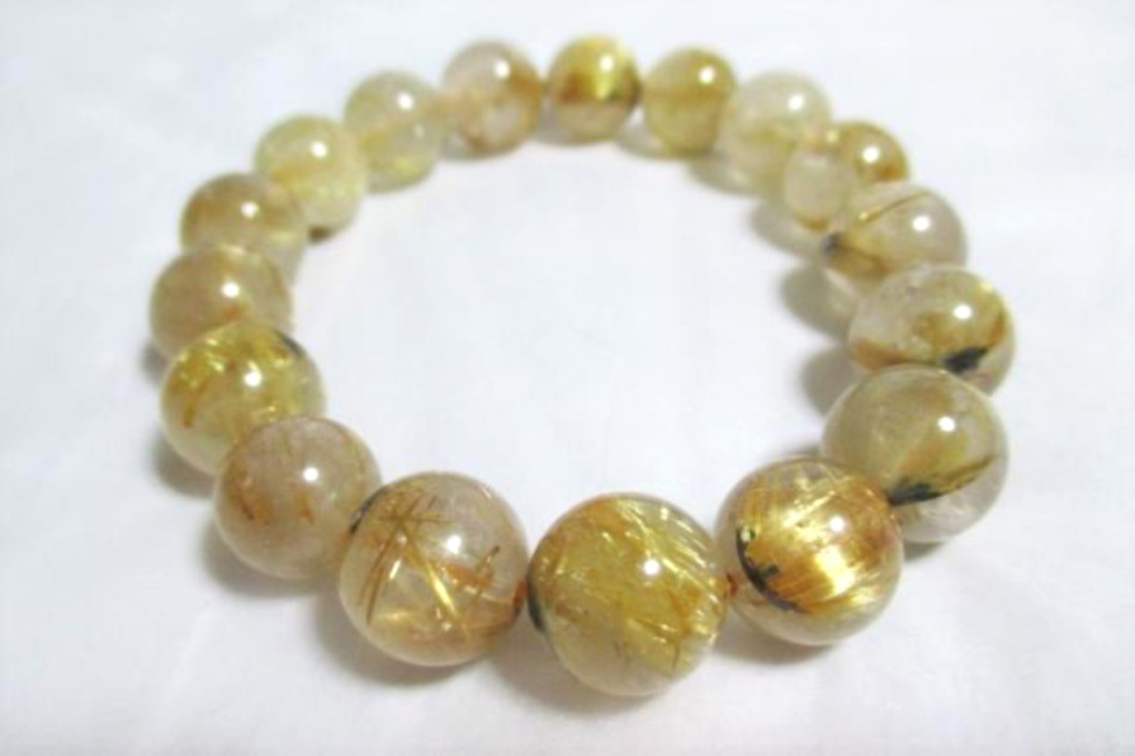 こういうブレスレットをご覧になったことはございませんか? この、「水晶の中に金色の針が入っている」石のことを、「ルチルクォーツ」、ちゃんと言うなら「ルチレイテッド(ルチルが入ったって意味)クォーツ」または「ルチルインクォーツ」と呼びます。
