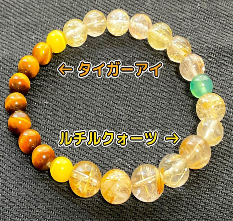 …でも気落ちしないで。茶色系のタイガーアイ(虎目石)と金色のルチルクォーツの組み合わせは金運上昇にお役立ちですよ。ルチルクォーツ単品でブレスレットとかにしないで、同量程度のタイガーアイも入れて使ってみて下さいね!