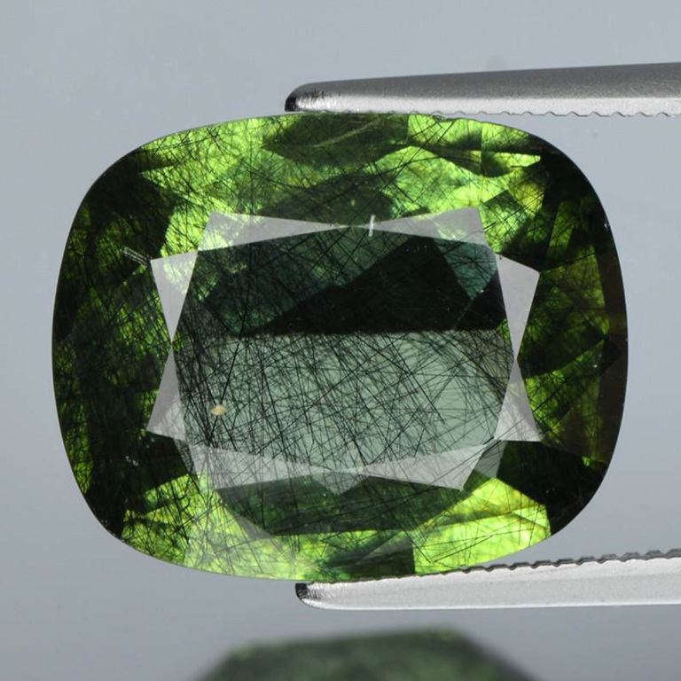 これは黒いですけど、入り込んでいるのはブラックトルマリンじゃないんです。この黒い部分は「ルドイジャイト(ルドイヒ石)」と呼ばれる石なんです。パキスタンで採れるペリドットにはこの石が針状になって含まれていることがあるんですよ。